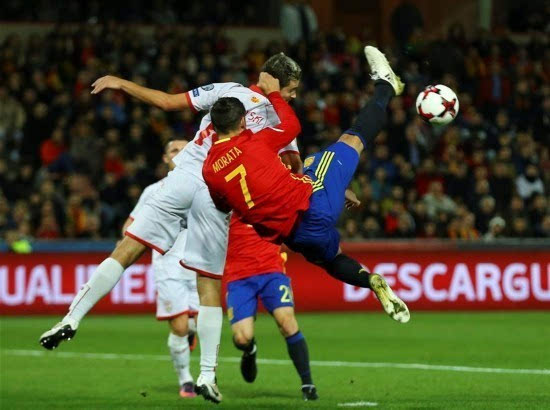 11月12日,西班牙隊(duì)球員莫拉塔(前)與馬其頓隊(duì)球員韋爾科夫斯基拼搶。當(dāng)日,在2018年俄羅斯世界杯歐洲區(qū)預(yù)選賽G組比賽中,西班牙隊(duì)主場(chǎng)以4比0戰(zhàn)勝馬其頓隊(duì)。