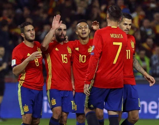 11月12日,西班牙隊(duì)球員慶祝得分。當(dāng)日,在2018年俄羅斯世界杯歐洲區(qū)預(yù)選賽G組比賽中,西班牙隊(duì)主場(chǎng)以4比0戰(zhàn)勝馬其頓隊(duì)。