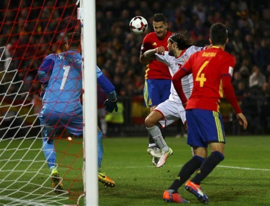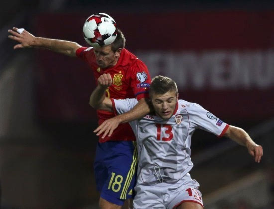 11月12日,西班牙隊(duì)球員蒙雷亞爾(左)與馬其頓隊(duì)球員里斯托夫斯基爭(zhēng)頂。當(dāng)日,在2018年俄羅斯世界杯歐洲區(qū)預(yù)選賽G組比賽中,西班牙隊(duì)主場(chǎng)以4比0戰(zhàn)勝馬其頓隊(duì)。