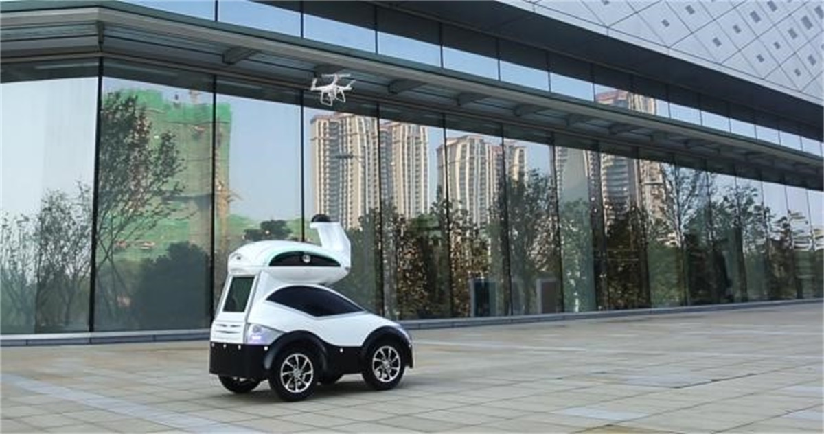 市場總監(jiān)劉勇先生介紹到,室外巡邏機器人APV其中最突出的一個特點就是可定制搭載無人機,在自主巡邏中可啟動無人機來監(jiān)控機器人無法到達的區(qū)域。在飛行結(jié)束后接收機器人發(fā)送的指令自動降落至搭載倉,飛行器的協(xié)同最大限度降低園區(qū)的安全盲點和提升了安全監(jiān)控的范圍。