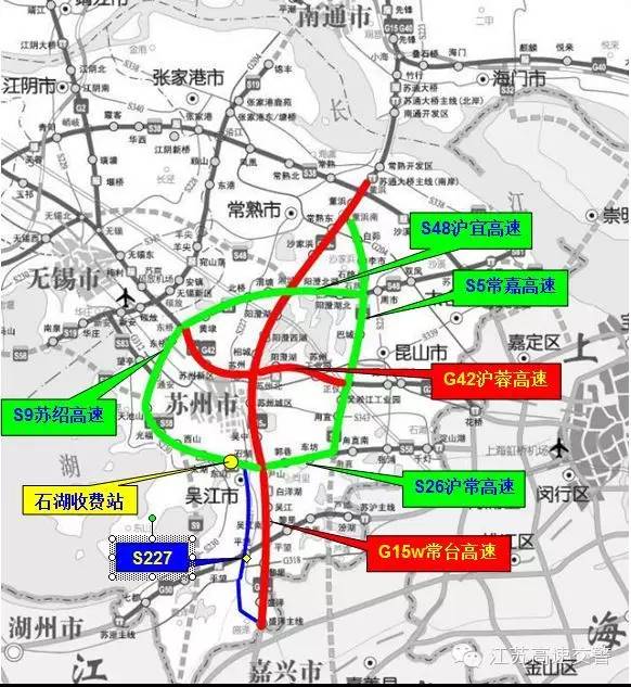①經G15w南向北至尹山樞紐轉S58滬常高速,至甪直樞紐轉S5常嘉高速繞行。