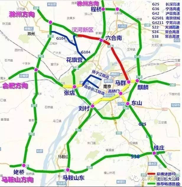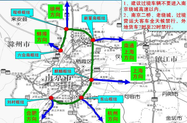 推薦路線:過境車輛不要進入南京繞城高速以內,同時由于南京二橋、老繞城路段,全天候禁行過境營運大客車,7時至22時禁行外地貨車,推薦南京過境車輛選擇G2501南京繞城高速,在重要樞紐節點處選擇相關高速通行。