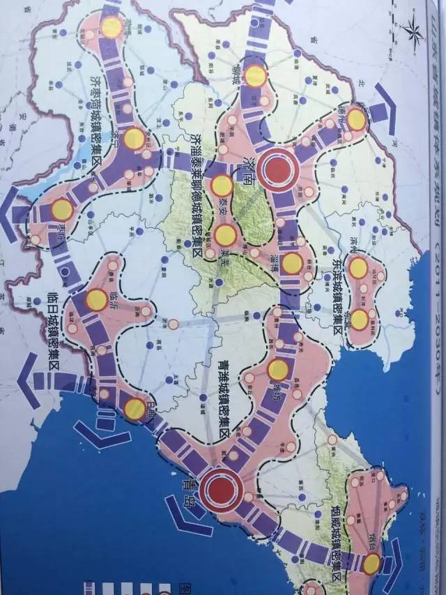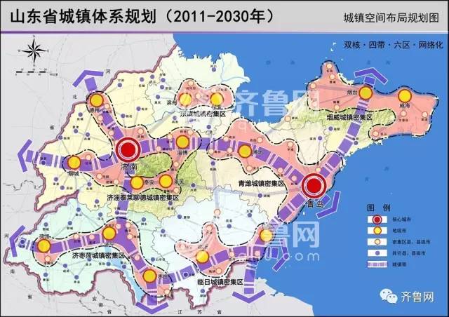 即濟南-淄博-泰安-萊蕪-德州-聊城、青島-濰坊、煙臺-威海、濟寧-棗莊-菏澤、東營-濱州、臨沂-日照等六個城鎮密集區,通過加快人口產業集聚,促進一體化發展,形成全省新型城鎮化的核心載體。
