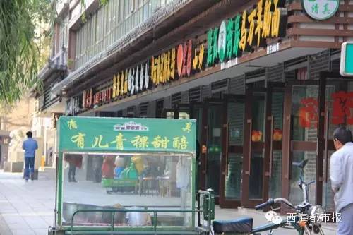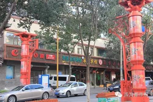 西寧市興海路“美食街”街牌的設計別具一格,在店面局部增添了花窗、燈籠等傳統中國元素;在這里不僅有青海特色的拜家釀皮、馬一刀烤肉等,還有湘菜、過橋米線、刀削面,東北餃子等特色飯館。