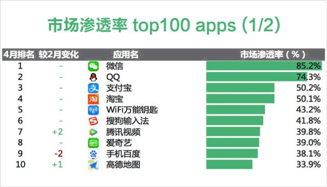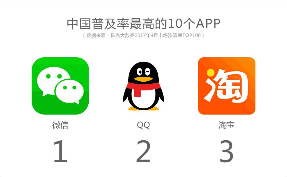 來自市場研究機構“極光大數據”的報告顯示,2017年4月市場滲透率TOP100應用榜單的第一名是微信,滲透率達到85.2%,相當于每100個用戶就有85個使用過微信。排在第二、三、四的分布是QQ、支付寶和淘寶,也都是我們最熟悉的手機APP。