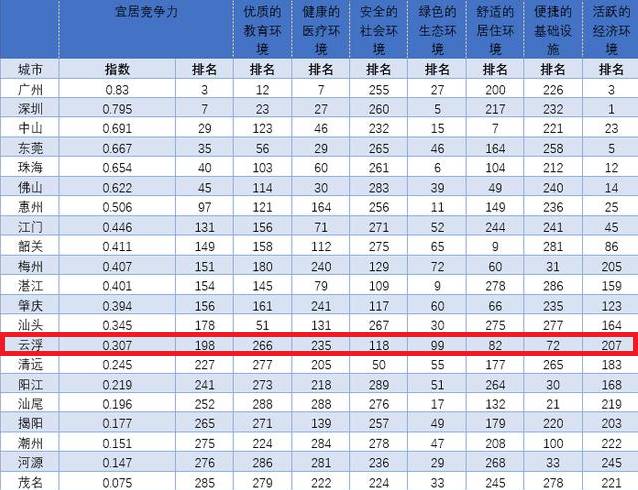 “舒適的居住環境”一項,云浮全國排第82!