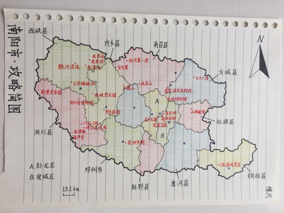 南陽市攻略簡圖,標注詳細,繪制精美到懷疑作者是否還是描紅的地圖。