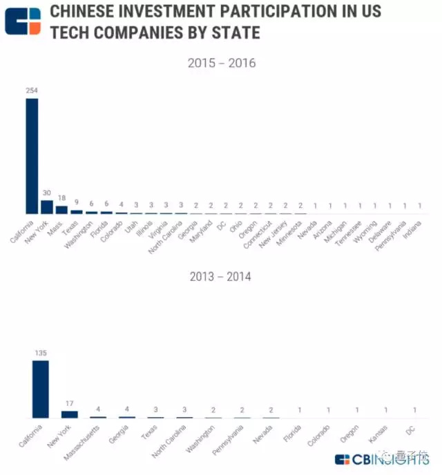 在對美國科技行業投資時,中國投資者逐漸把目光瞄向大型科技中心之外的其他地方。2013至2014年,中國投資者投資的科技公司總部遍布美國13個州和華盛頓特區。但在2015和2016年間,中國投資者投資的公司所在州的數量增長一倍。