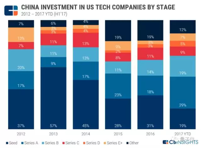 2016年和2017年以來,中國投資者參與的美國科技交易只有不到一半處于早期階段(種子輪、天使輪和A輪)。與此同時,2017年上半年,中國投資者參與的美國科技交易有19%屬于B輪。