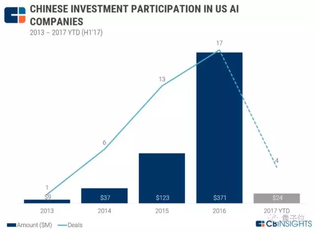 過去5年,人工智能的確成為中國投資者在美國的投資重點:自從2013年以來,中國投資者參與了美國人工智能公司的41筆交易。