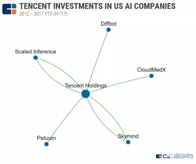 騰訊成為美國人工智能公司最活躍的投資者,共投資了5家從事深度學習、視覺學習、臨床人工智能和人工智能即服務的公司。