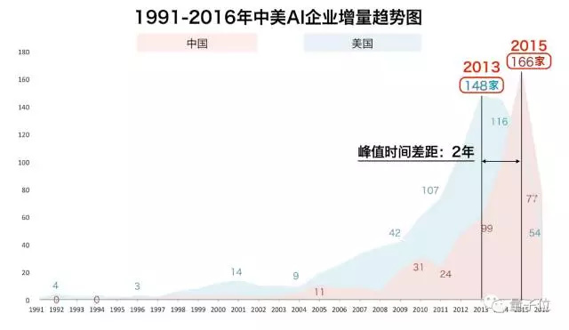 從歷史統計來看,美國人工智能企業的發展早于中國5年。