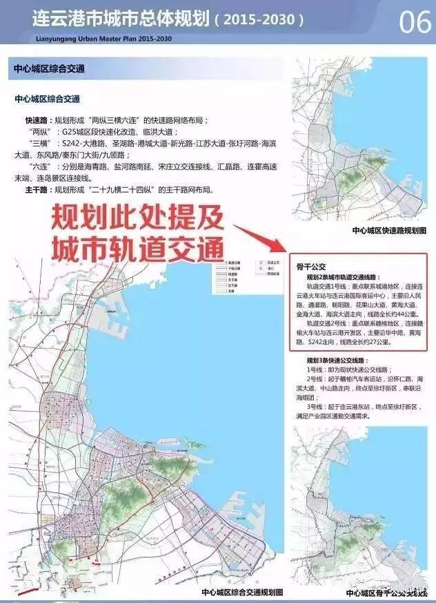 軌道交通2號線:重點聯系贛榆地區,連接贛榆火車站與連云港開發區,主要沿華中路、黃海路、S242走向,線路全長約27公里。