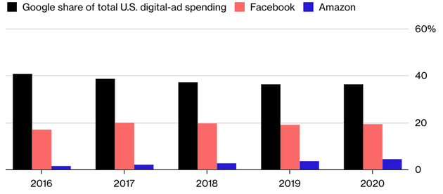 不同企業在美國數字廣告市場份額(黑色為谷歌,粉紅色為Facebook,藍色為亞馬遜)
