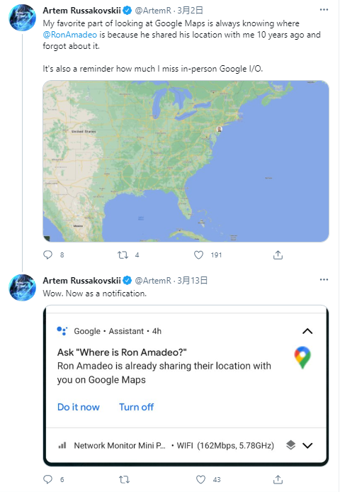 正如通知中所說,用戶現(xiàn)在可以詢問谷歌助手這些人的位置。當(dāng)詢問“嘿,谷歌,(某人)在哪里”后,將顯示一個地圖片段,其中包含該人的位置,前提是他們已經(jīng)開啟了共享。如果當(dāng)事人沒有與用戶分享他們的行蹤,用戶可以直接從谷歌助手發(fā)送請求。