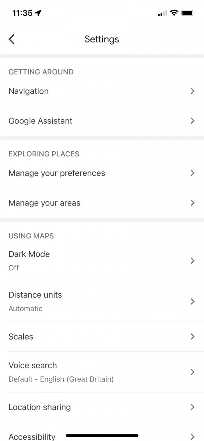 在iOS上的Google地圖主界面,點擊屏幕右上方的個人資料圖片。從菜單中挑選"設置",然后從使用地圖部分選擇"黑暗模式"。這里你有三個選項。開啟、關閉和"與設備設置相同"(根據你在操作系統層面的啟用情況,自動開啟或關閉黑暗模式)。
