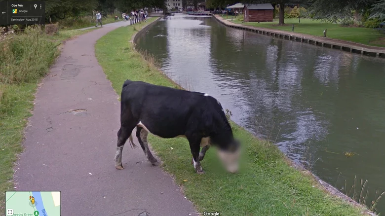 在街景拍攝的所有圖像中,車牌和人臉都被自動模糊化。到目前為止,這已經足以緩解大多數人的擔憂,而且進行模糊處理的算法似乎也做得很好。然而由于計算機程序是由人類創造的,而人類并不完美,計算機程序也不完美。于是,上面這張圖片的算法就表現有點過頭了,因為它為劍橋的一頭牛也打上了馬賽克。