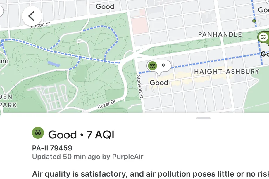 更精確的是,它還展示了從PurpleAir的傳感器網(wǎng)絡(luò)收集的數(shù)據(jù),以報告來自街道層面的精細狀況。點擊點綴在Google地圖上的空氣質(zhì)量指數(shù)讀數(shù),可以提供更多關(guān)于空氣質(zhì)量對健康影響的信息,最后一次讀數(shù)的時間和來源,以及了解更多信息的鏈接。